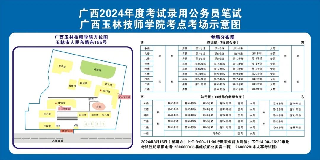 廣西2024年度考試錄用公務(wù)員(選調(diào)生)筆試將于3月16日舉行,為進(jìn)一步提升玉林考區(qū)服務(wù)保障質(zhì)量,現(xiàn)就有關(guān)注意事項(xiàng)提示如下,請廣大考生做好應(yīng)試準(zhǔn)備工作,準(zhǔn)確掌握考試時(shí)間、考點(diǎn)地址及相關(guān)注意事項(xiàng)。