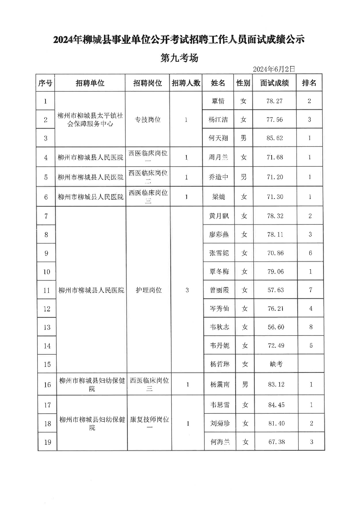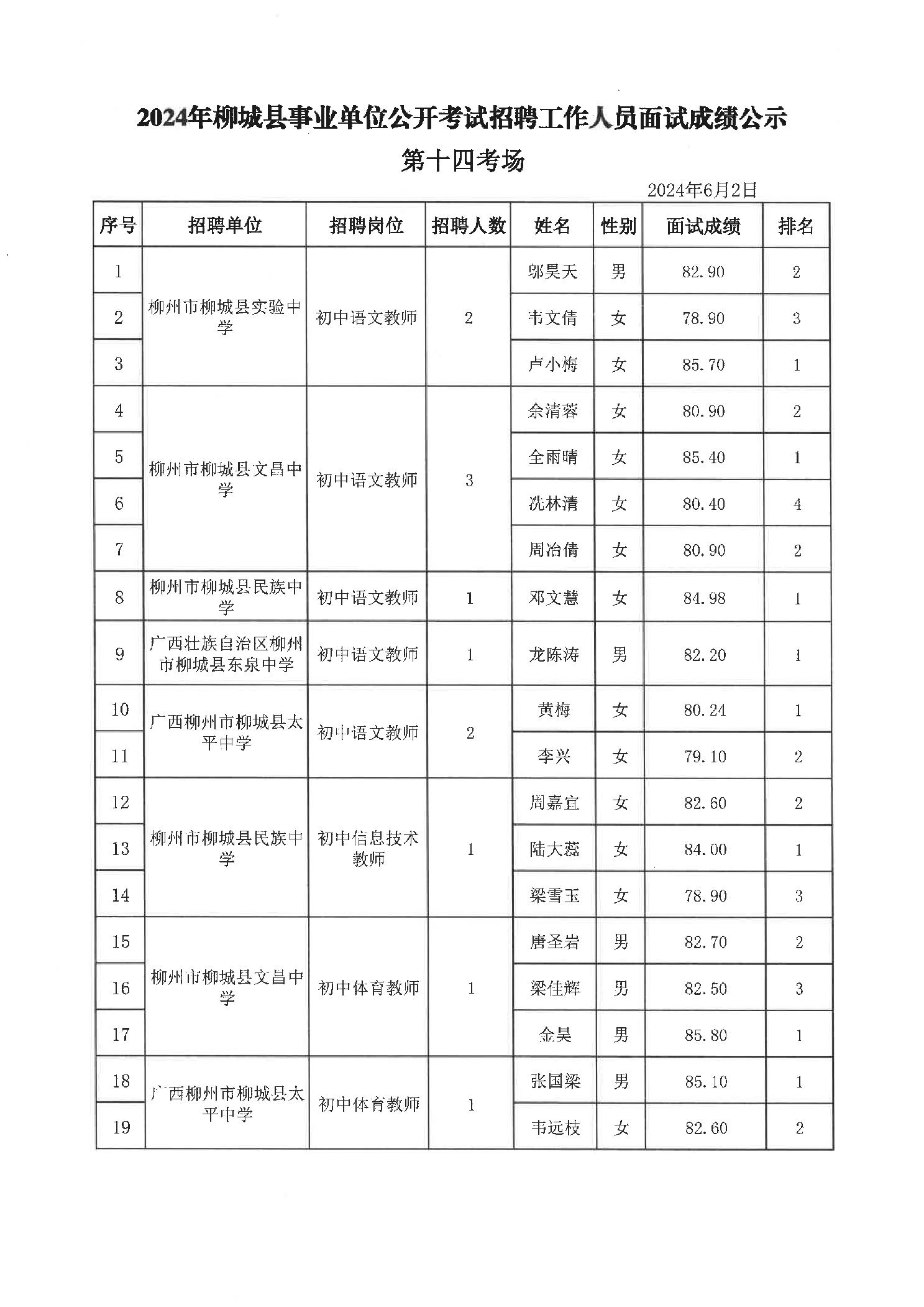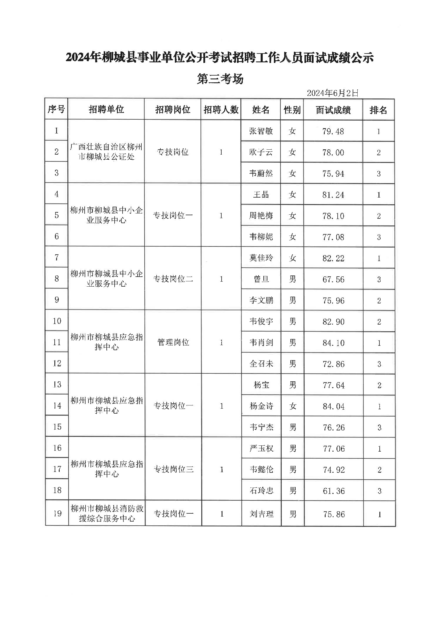 原文標題:2024年柳州市事業(yè)單位公開考試招聘工作人員面試成績公示(柳城縣崗位)