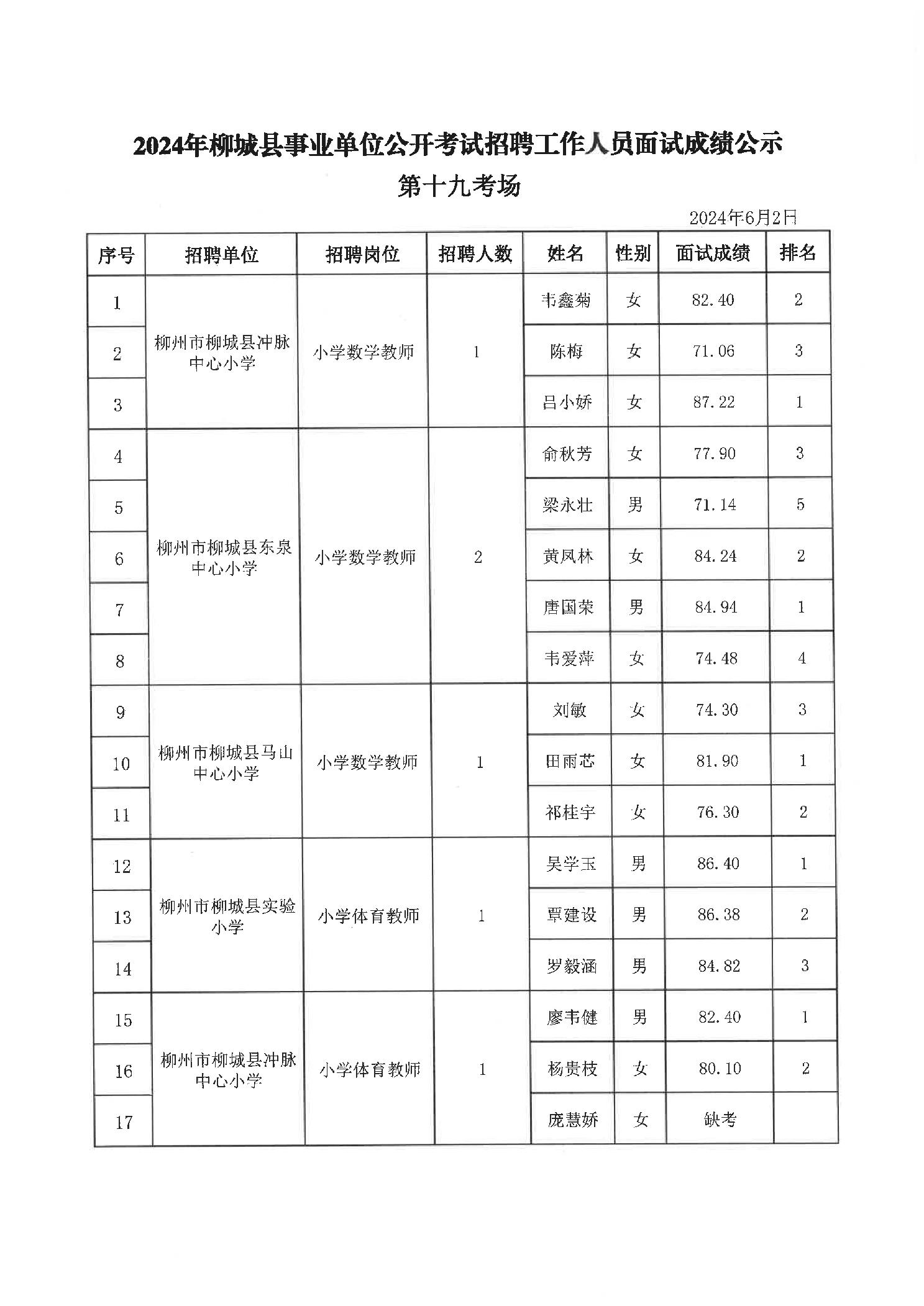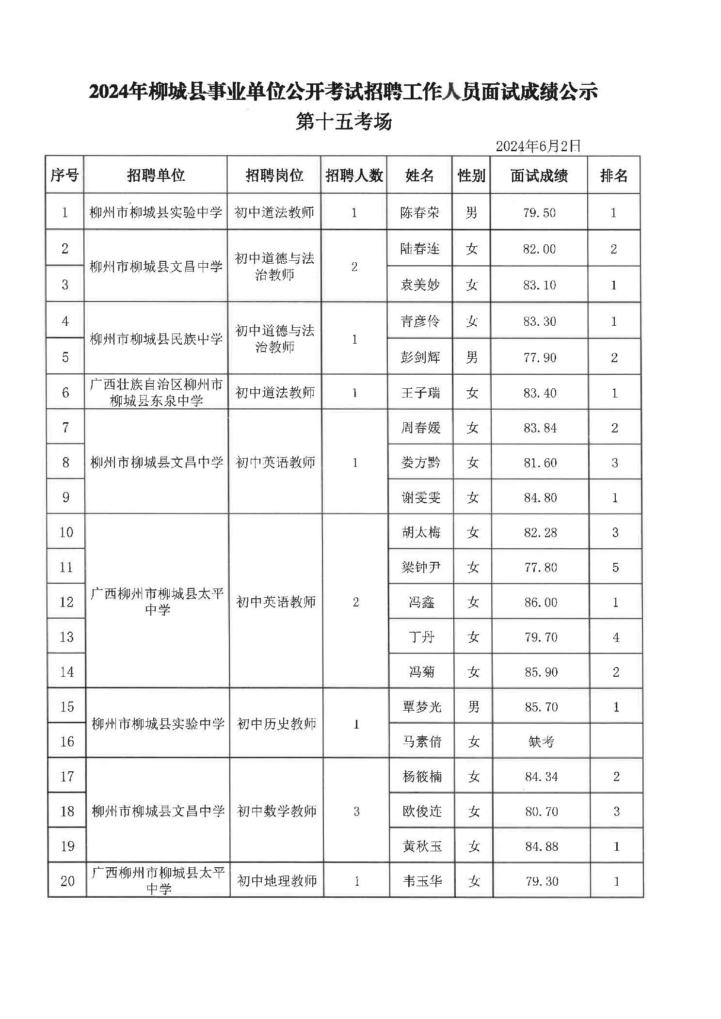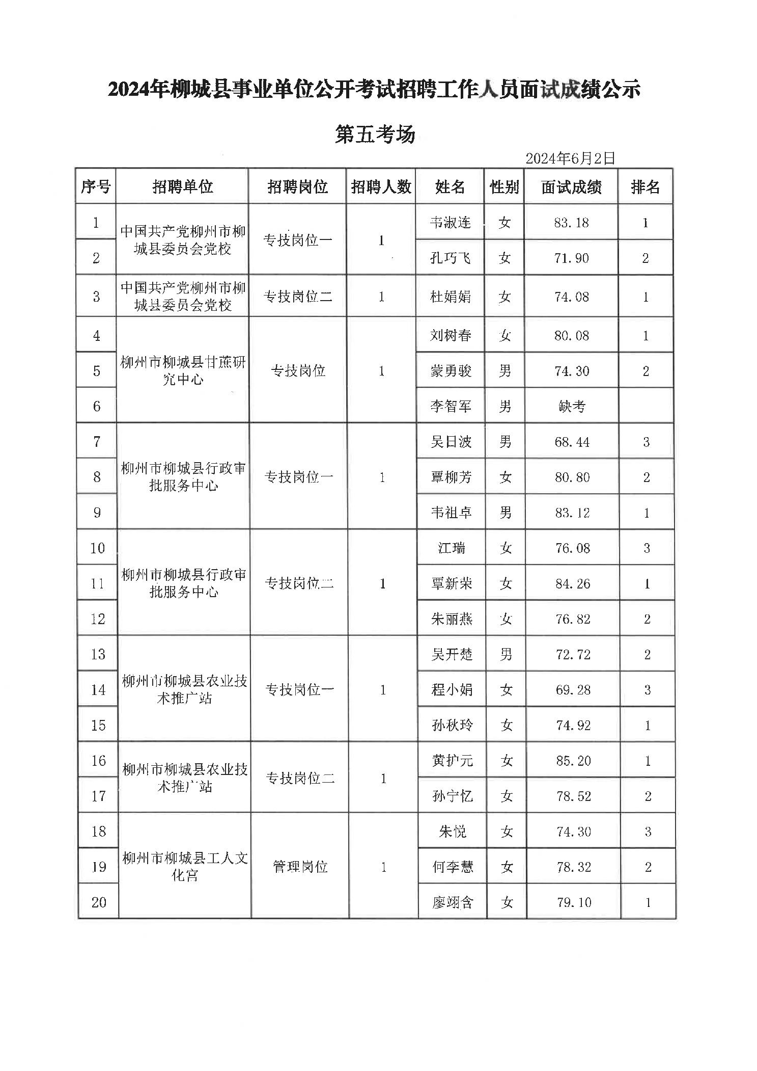 2024年柳城縣事業(yè)單位公開考試招聘工作人員面試成績公示