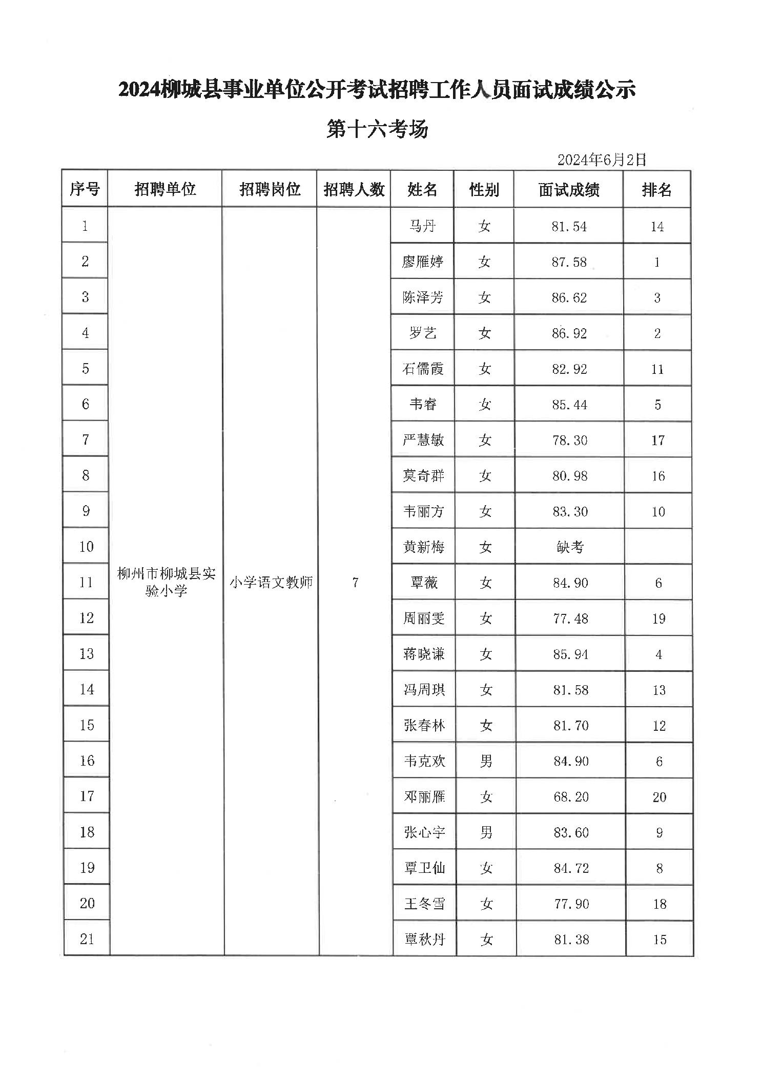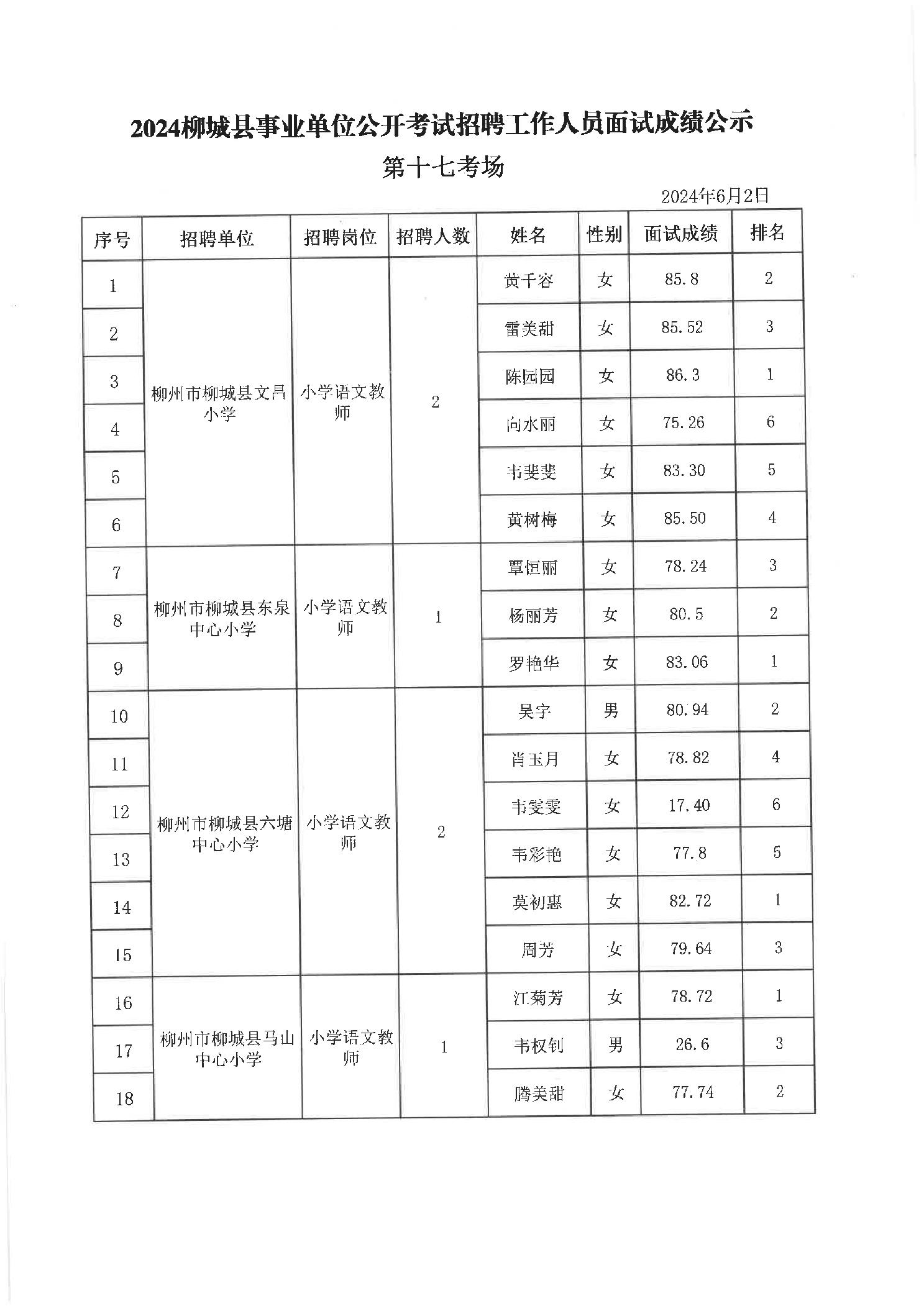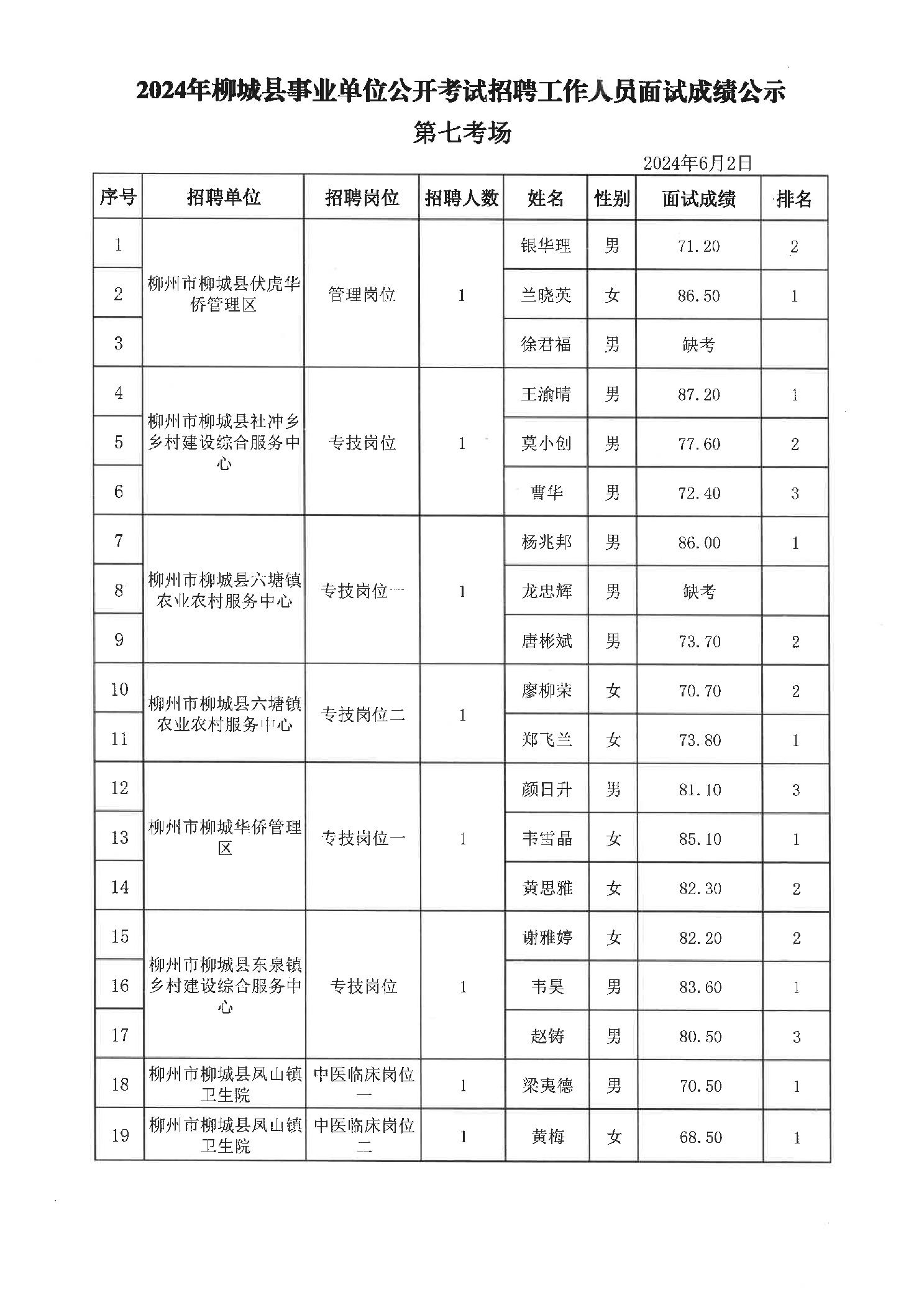 2024年柳城縣事業(yè)單位公開考試招聘工作人員面試成績公示