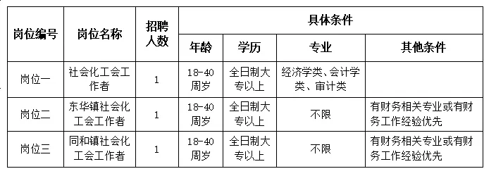 (五)具有全日制大專以上文化程度,年齡18-40周歲,性別不限;崗位一專業(yè)必須為經(jīng)濟(jì)學(xué)類、會計學(xué)類、審計類專業(yè);崗位二、崗位三專業(yè)不限,同等條件下,有財務(wù)相關(guān)專業(yè)或有財務(wù)工作經(jīng)驗優(yōu)先;