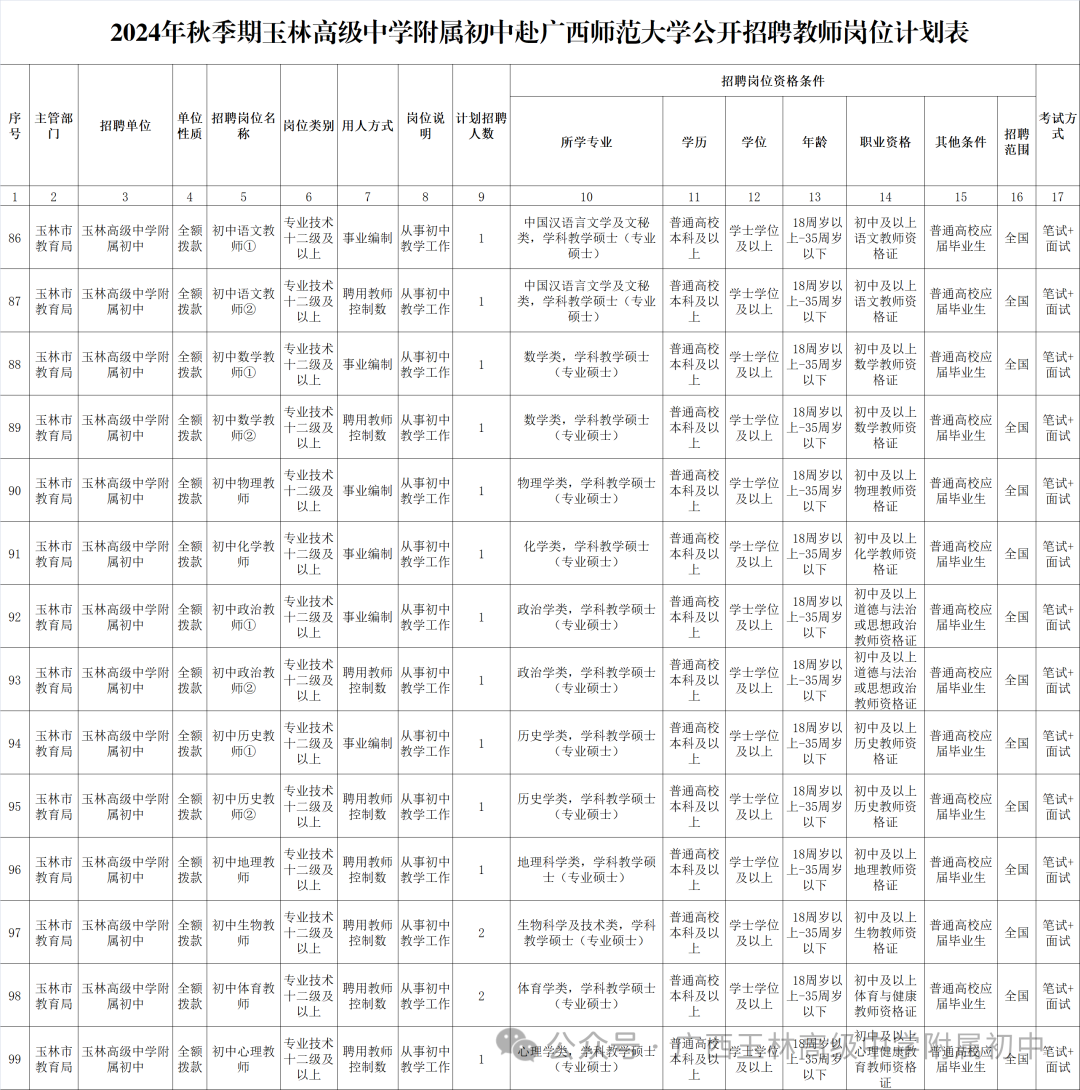 具體招聘信息請(qǐng)瀏覽玉林市人社局網(wǎng)站相關(guān)公告http://rsj.yulin.gov.cn/tszl/rsrc/sydwzk/t19343053.shtml,以《2024年秋季期玉林市教育局直屬學(xué)校赴廣西師范大學(xué)公開(kāi)招聘教師公告》為準(zhǔn)。