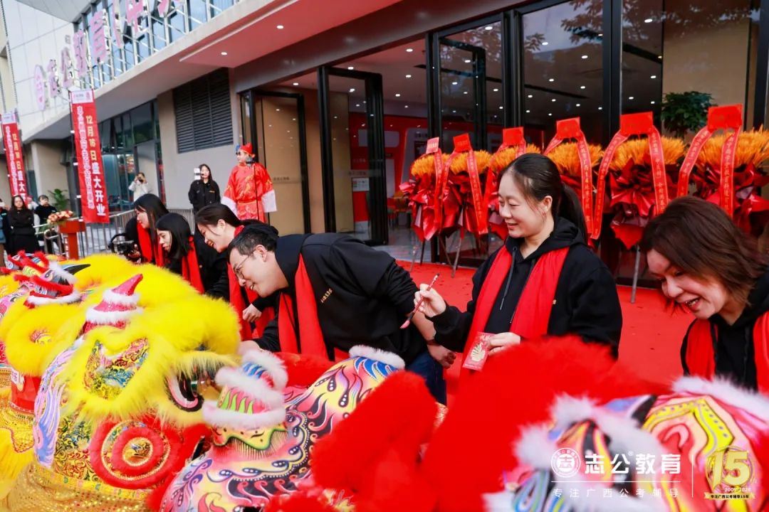 志公教育還專門請(qǐng)來(lái)了舞獅隊(duì),舞獅點(diǎn)睛是重頭戲,董事長(zhǎng)李勇帶領(lǐng)著公司領(lǐng)導(dǎo)們手持毛筆蘸取朱砂,對(duì)獅頭天庭進(jìn)行點(diǎn)睛。