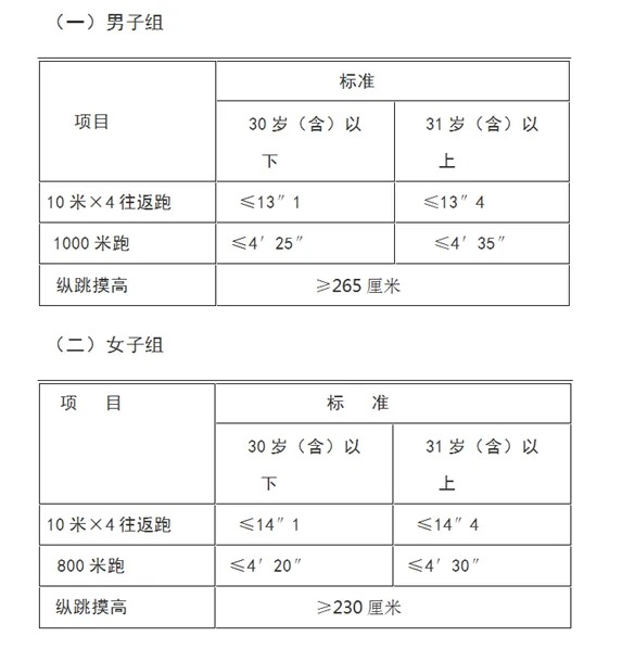 報(bào)考人員須參加全部三項(xiàng)體能測(cè)評(píng),全部達(dá)標(biāo)方為合格,如放棄一項(xiàng)則視為不合格,體能測(cè)評(píng)合格的方可進(jìn)入下一環(huán)節(jié)。