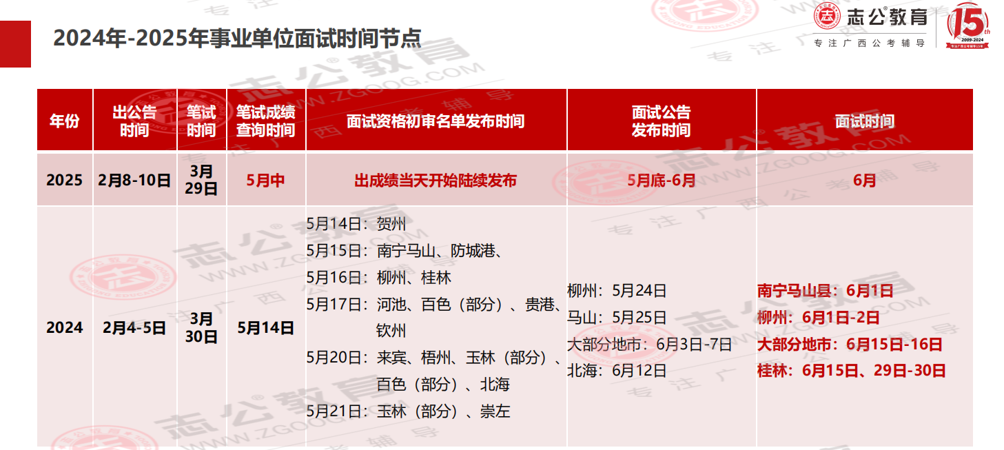 2024年廣西事業(yè)單位3月30日筆試,5月14日成績發(fā)布,最早6月1日面試,出名單到面試間隔僅2周時(shí)間備考;2025年3月29日筆試,考試周期和去年基本重合,大家可以參考去年時(shí)間,提前備考面試。