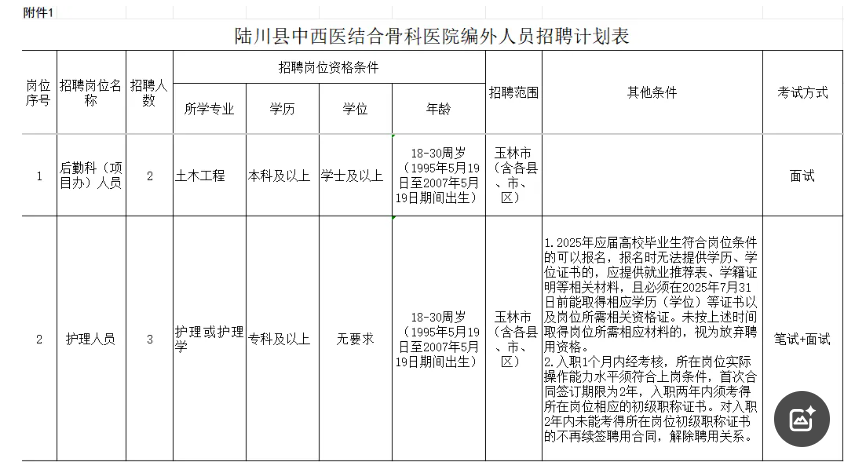 具體相關(guān)專業(yè)崗位條件詳見《陸川縣中西醫(yī)結(jié)合骨科醫(yī)院編外人員招聘計(jì)劃表》(附件1)。