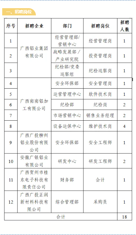 2.報名方式:應(yīng)聘者可登錄廣投集團官方網(wǎng)站(http://www.gig.cn),依次點擊“人力資源-廣納英才”,進入“社會招聘-招聘崗位”專欄,找到“鋁業(yè)”相應(yīng)崗位并投遞簡歷。