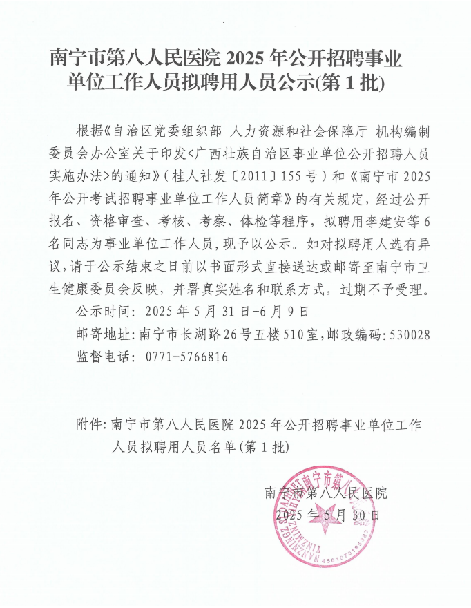 南寧市第八人民醫(yī)院2025年公開(kāi)招聘事業(yè)單位工作人員擬聘用人員公示(第1批)