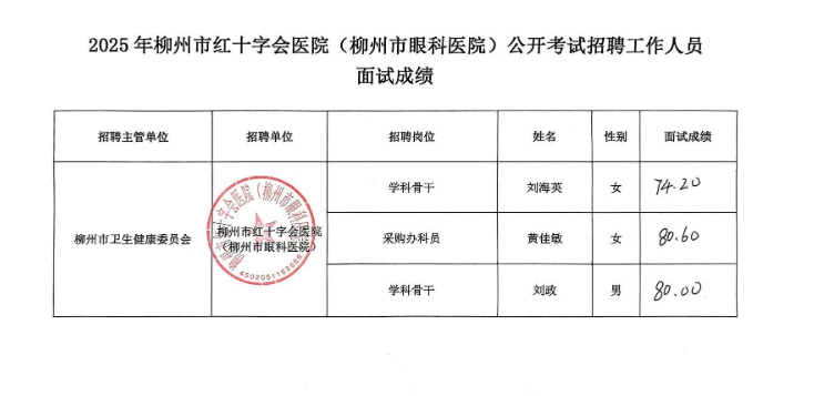 2025年度柳州市紅十字會(huì)醫(yī)院(柳州市眼科醫(yī)院)公開招聘中高級(急需緊缺)人才(第二批)面試成績公示