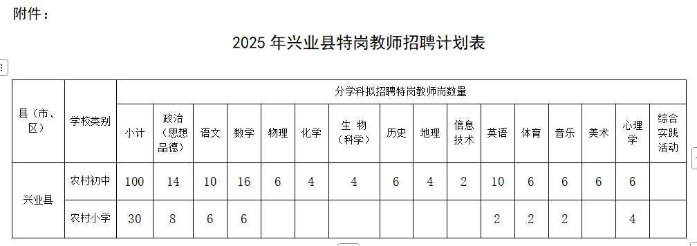 附件: 2025年興業(yè)縣特崗教師招聘計劃表