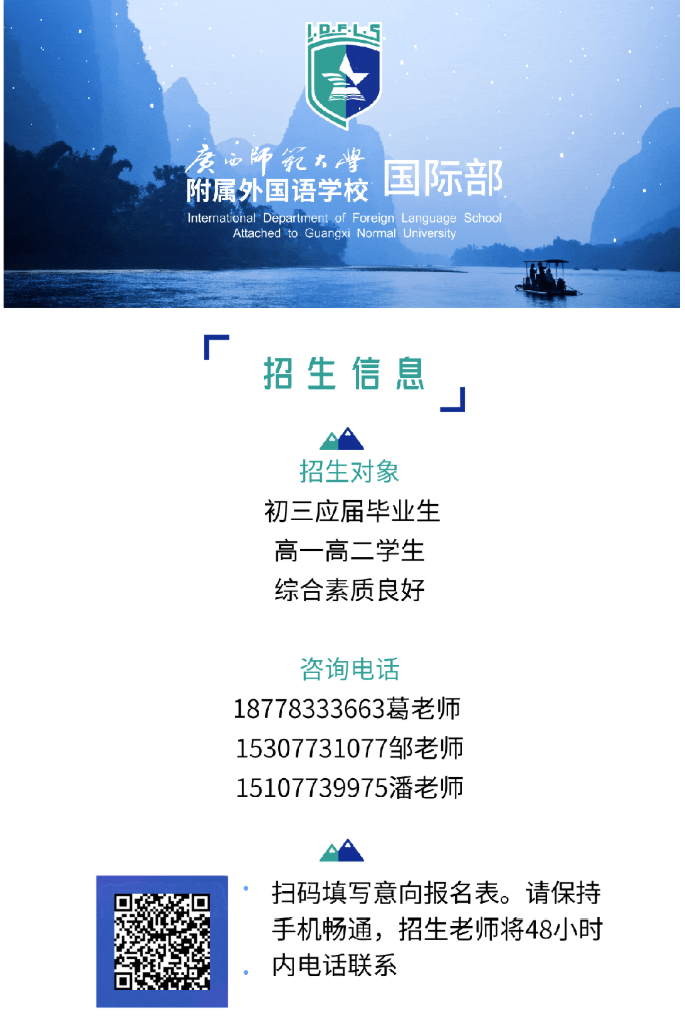 廣西師范大學(xué)附屬外國語學(xué)校位于以山水之美聞名世界的桂林市,教育教學(xué)成績斐然。其國際部是廣西壯族自治區(qū)最早批準(zhǔn)成立的國際部,自2011年成立以來,積極引進(jìn)國外先進(jìn)教育理念,整合師大附外的優(yōu)質(zhì)基礎(chǔ)教育資源,堅(jiān)持社會主義核心價值觀為導(dǎo)向,培養(yǎng)具有崇高理想、愛國信念和突出跨文化交際能力的社會主義新型人才。