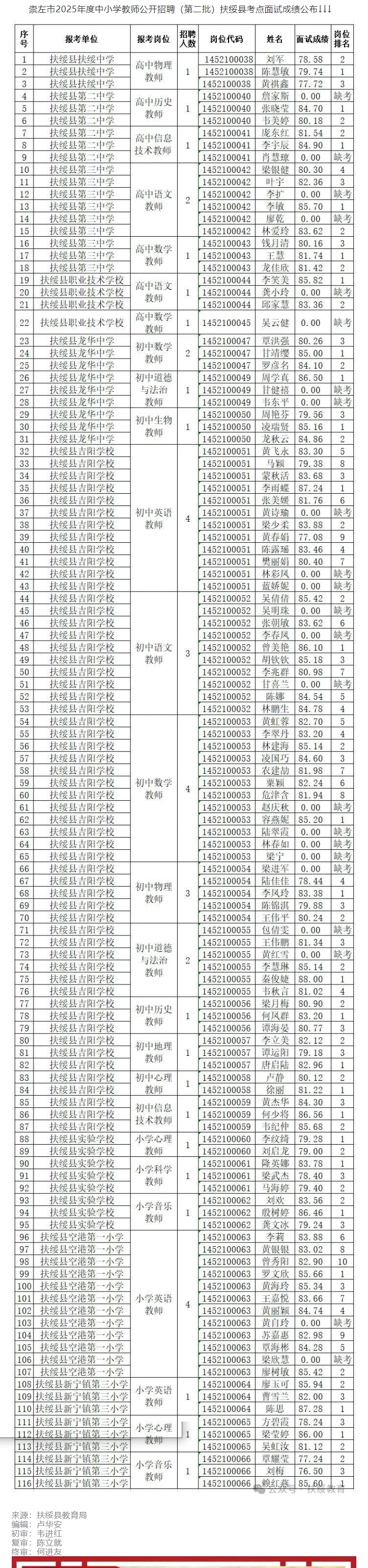 崇左市2025年度中小學(xué)教師公開招聘(第二批)扶綏縣考點面試成績公布