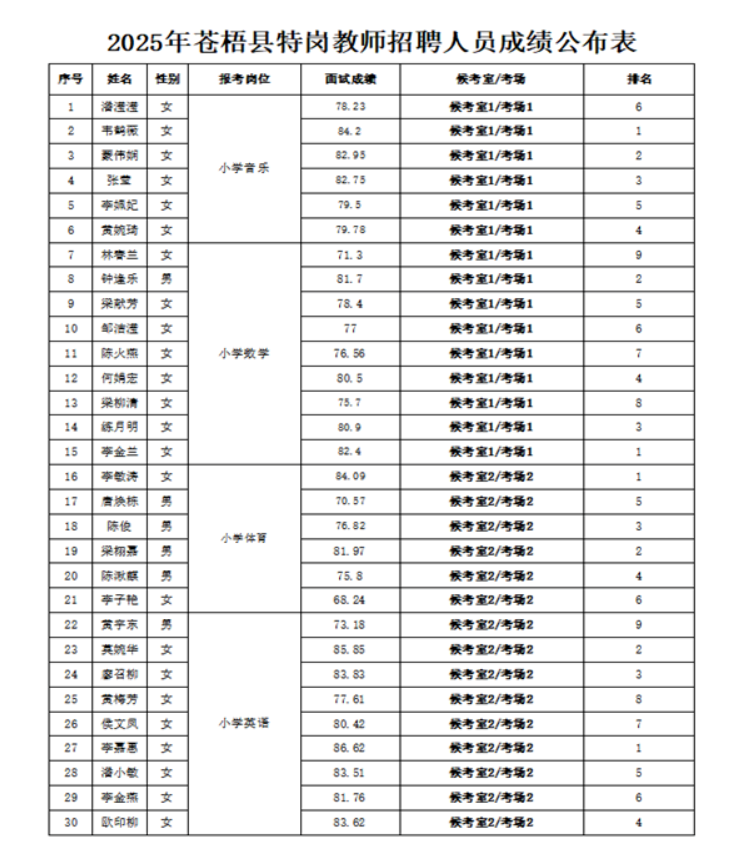 原文標題:2025年蒼梧縣特崗教師招聘人員面試成績公布