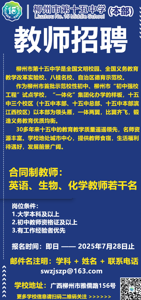 2025年柳州市第十五中學本部誠聘英才若干名