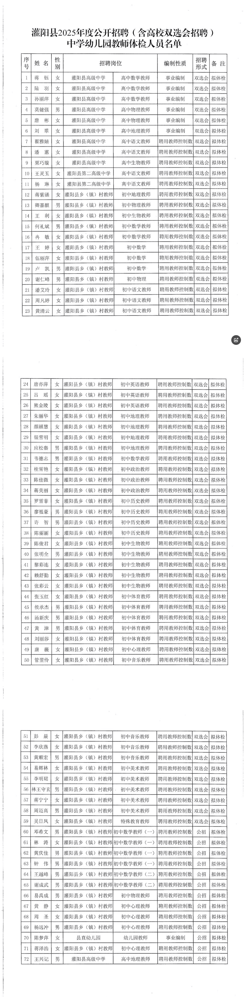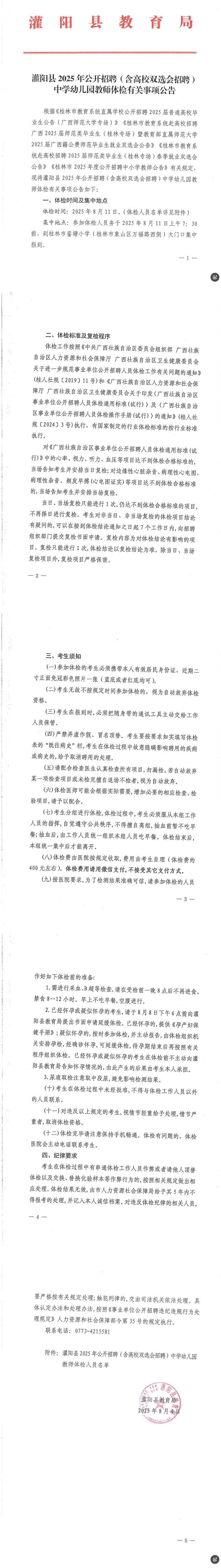 灌陽縣2025年公開招聘(含高校雙選會招聘)中學(xué)幼兒園教師體檢有關(guān)事項(xiàng)公告