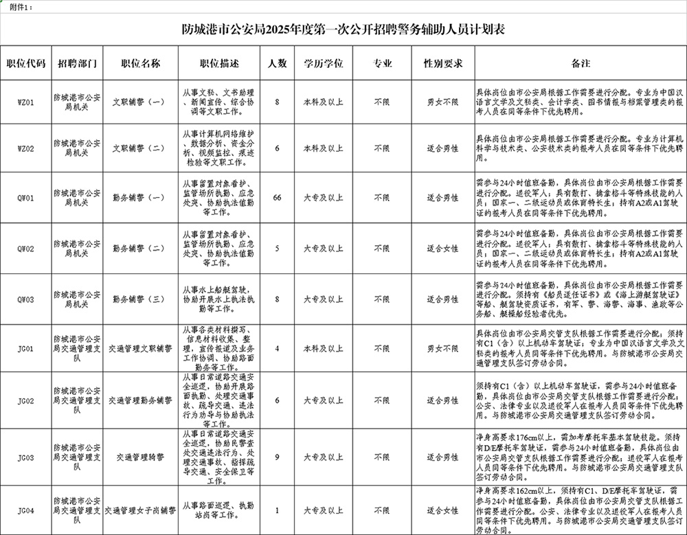 根據(jù)《廣西壯族自治區(qū)公安機(jī)關(guān)警務(wù)輔助人員條例》《廣西公安機(jī)關(guān)警務(wù)輔助人員招聘管理辦法(試行)》以及《防城港市公安機(jī)關(guān)警務(wù)輔助人員管理暫行辦法》等法律法規(guī)和文件規(guī)定,防城港市公安局決定2025年度第一次面向社會(huì)公開招聘警務(wù)輔助人員?,F(xiàn)將有關(guān)事項(xiàng)公告如下: