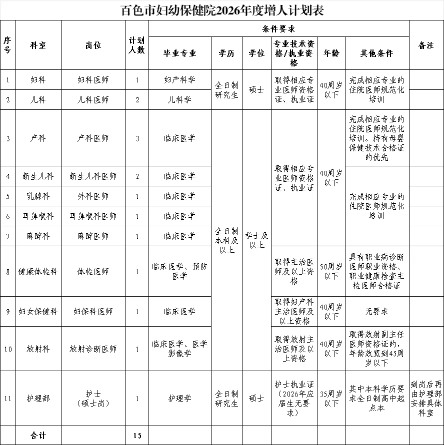 原文標(biāo)題:百色市婦幼保健院2026年崗位招聘公告