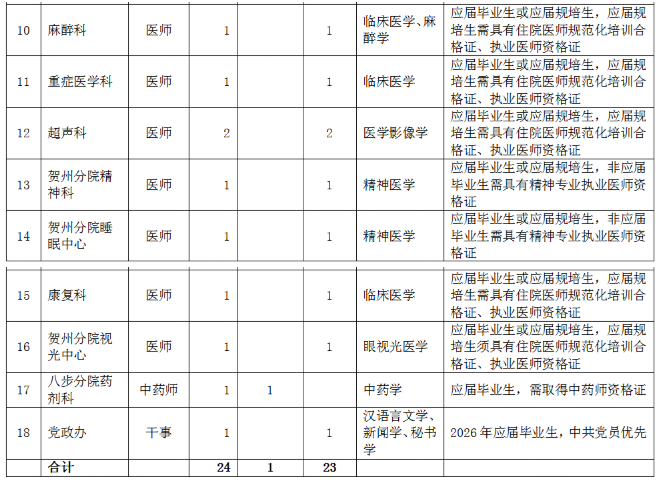 (應(yīng)聘報(bào)名二維碼)同時(shí),按以下要求提供個(gè)人應(yīng)聘材料(電子版)發(fā)電子郵箱:gdyy2817726@163.com(郵件主題請(qǐng)標(biāo)明:“姓名+賀州兩分院”字樣)。應(yīng)屆畢業(yè)生:個(gè)人簡(jiǎn)歷、身份證、就業(yè)推薦表、成績(jī)單、各種獎(jiǎng)項(xiàng)獎(jiǎng)勵(lì)證書(shū)、外語(yǔ)等級(jí)證書(shū)等。非應(yīng)屆畢業(yè)生:個(gè)人簡(jiǎn)歷、身份證、畢業(yè)證、畢業(yè)證備案登記表、學(xué)位證、學(xué)位證備案登記表、職稱(chēng)證、執(zhí)業(yè)證、住院醫(yī)師規(guī)范化培訓(xùn)合格證、工作證明等。報(bào)名時(shí)所提交的申請(qǐng)材料必須真實(shí)、準(zhǔn)確,因報(bào)名時(shí)提交的申請(qǐng)材料不真實(shí)、不完整或錯(cuò)誤填寫(xiě)報(bào)名信息,造成資格審查、面試資格審查不通過(guò)的,后果由報(bào)名人員自行承擔(dān)。(2)資格審核。人事科依據(jù)招聘公告和用人需求規(guī)定的資格條件對(duì)應(yīng)聘人員簡(jiǎn)歷進(jìn)行收集和資格初步審查,經(jīng)招聘工作領(lǐng)導(dǎo)小組審核后,確定符合崗位條件報(bào)名人員名單,由醫(yī)院人事科電話或短信通知符合條件人員。(3)考核??己斯P試和面試由人事科負(fù)責(zé)組織實(shí)施,協(xié)助部門(mén)為醫(yī)務(wù)部、護(hù)理部、科教科以及用人科室,紀(jì)律監(jiān)督部門(mén)為監(jiān)察室。逾期未參加則視為自愿放棄。(4)試工。通過(guò)考核的非應(yīng)屆畢業(yè)應(yīng)聘人員,須到醫(yī)院試工5天。試工不通過(guò),不予聘用。(5)體檢。體檢工作由廣西壯族自治區(qū)桂東人民醫(yī)院按照有關(guān)規(guī)定統(tǒng)一組織。體檢標(biāo)準(zhǔn)參照《廣西壯族自治區(qū)事業(yè)單位公開(kāi)招聘人員體檢通用標(biāo)準(zhǔn)(試行)》《廣西壯族自治區(qū)事業(yè)單位公開(kāi)招聘人員體檢操作手冊(cè)(試行)》執(zhí)行。體檢不合格或隱瞞真實(shí)情況致使體檢結(jié)果失真的,不予聘用。因體檢不合格空缺崗位的,將按考核的綜合成績(jī),從高到低,順位補(bǔ)充體檢人員。(6)公示和聘用。對(duì)擬聘非應(yīng)屆畢業(yè)應(yīng)聘者在全院范圍內(nèi)進(jìn)行公示,公示期為5個(gè)工作日,公示期滿(mǎn)無(wú)異議按程序辦理聘用手續(xù)。對(duì)公示有異議,經(jīng)核實(shí)影響聘用的,取消其聘用資格;對(duì)反映問(wèn)題難以核實(shí)的暫緩聘用,待核實(shí)清楚后按有關(guān)規(guī)定辦理。