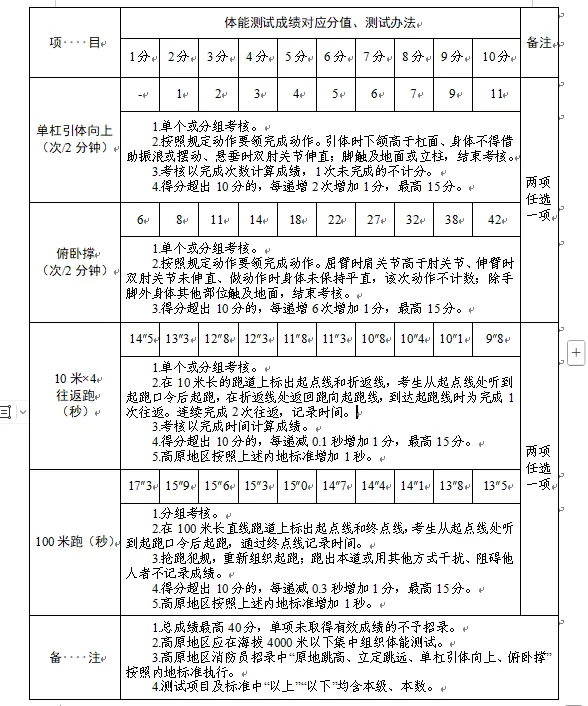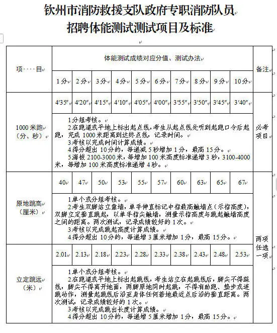 2.體能測(cè)試:(1)必考項(xiàng)目:1000米跑;(2)選考項(xiàng)目:①立定跳遠(yuǎn)、原地跳高二選一;②單杠引體向上、俯臥撐二選一;③10米×4往返跑、100米跑二選一;(3)注意事項(xiàng):體能測(cè)試有兩項(xiàng)及兩項(xiàng)以上不得分的視為不合格(標(biāo)準(zhǔn)參照附件)。未按時(shí)參加或因身體原因無法測(cè)試者,視為自動(dòng)放棄。