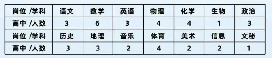學(xué)校于2023年9月1日正式開學(xué),現(xiàn)有30個(gè)行政班,一千余名學(xué)生,專任教師128人,發(fā)展勢(shì)頭強(qiáng)勁。為適應(yīng)學(xué)校未來發(fā)展需要,特面向全國師范類畢業(yè)生擇優(yōu)招聘青年教師若干,詳情如下:
