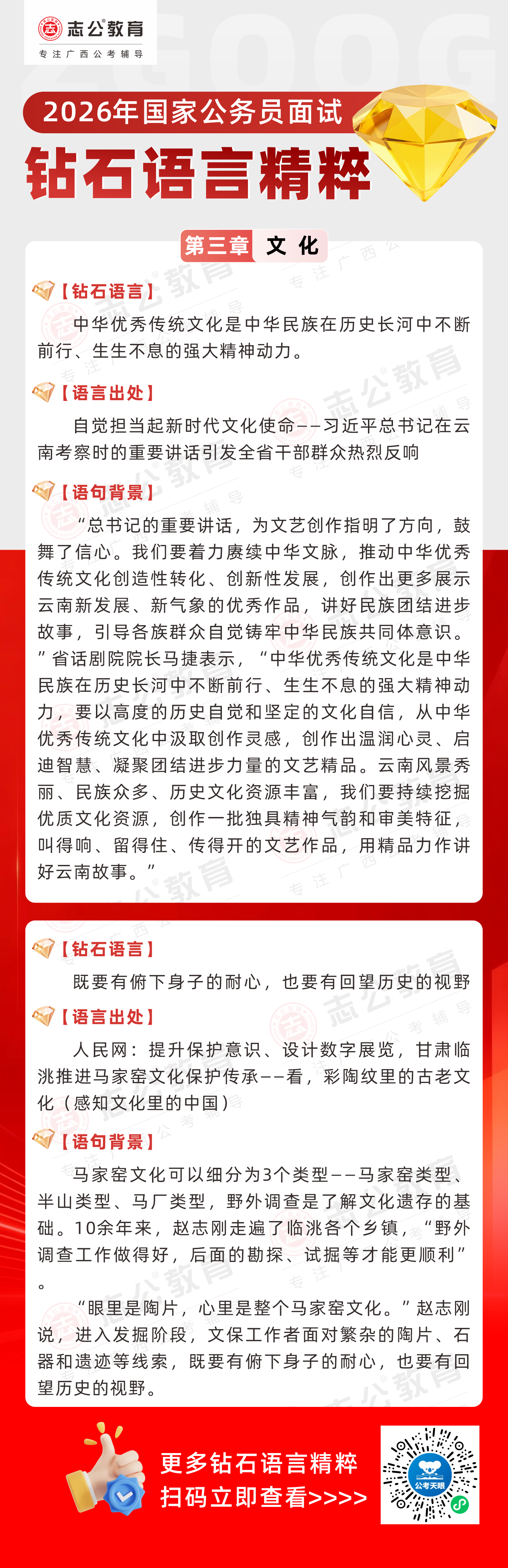 志公教育推出《2026國(guó)家公務(wù)員面試·鉆石語(yǔ)言精粹》!幫助考生把握文化類題目應(yīng)答邏輯,提升語(yǔ)言表達(dá)層次,助你在面試中脫穎而出。備考2026國(guó)考面試,從掌握“鉆石語(yǔ)言”開始!