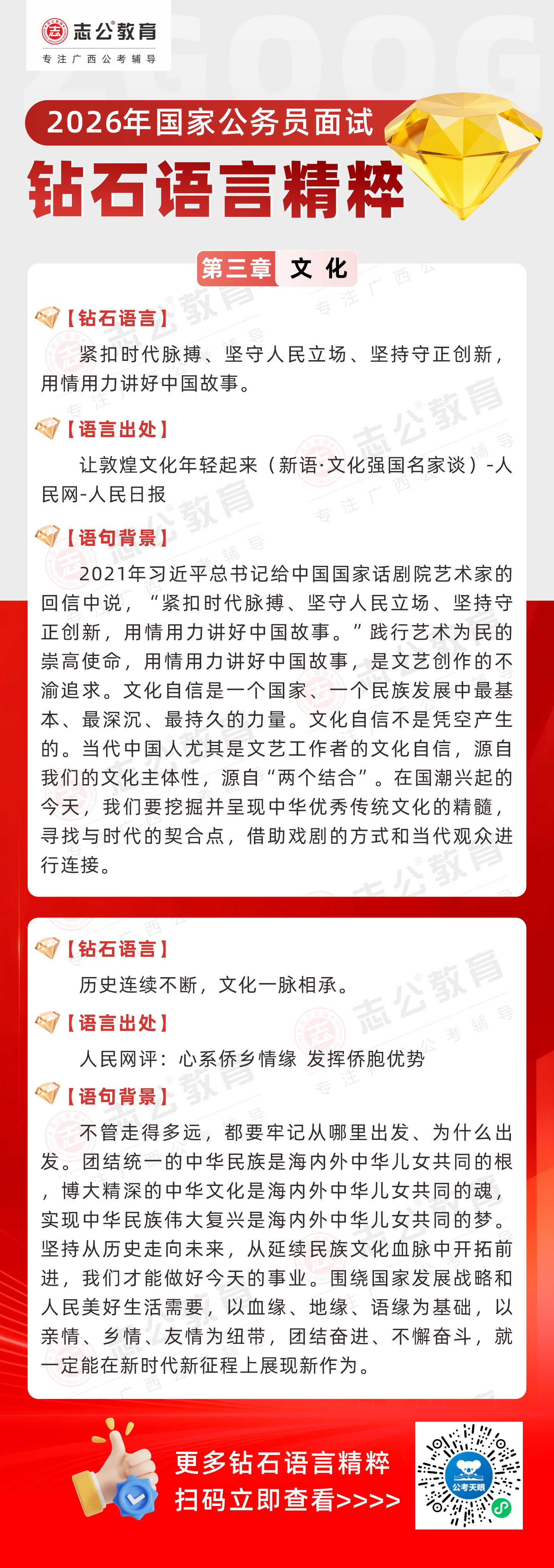 志公教育推出《2026國家公務員面試·鉆石語言精粹》文化篇!幫助考生把握文化類題目應答邏輯,提升語言表達層次,助你在面試中脫穎而出。備考2026國考面試,從掌握“鉆石語言”開始!