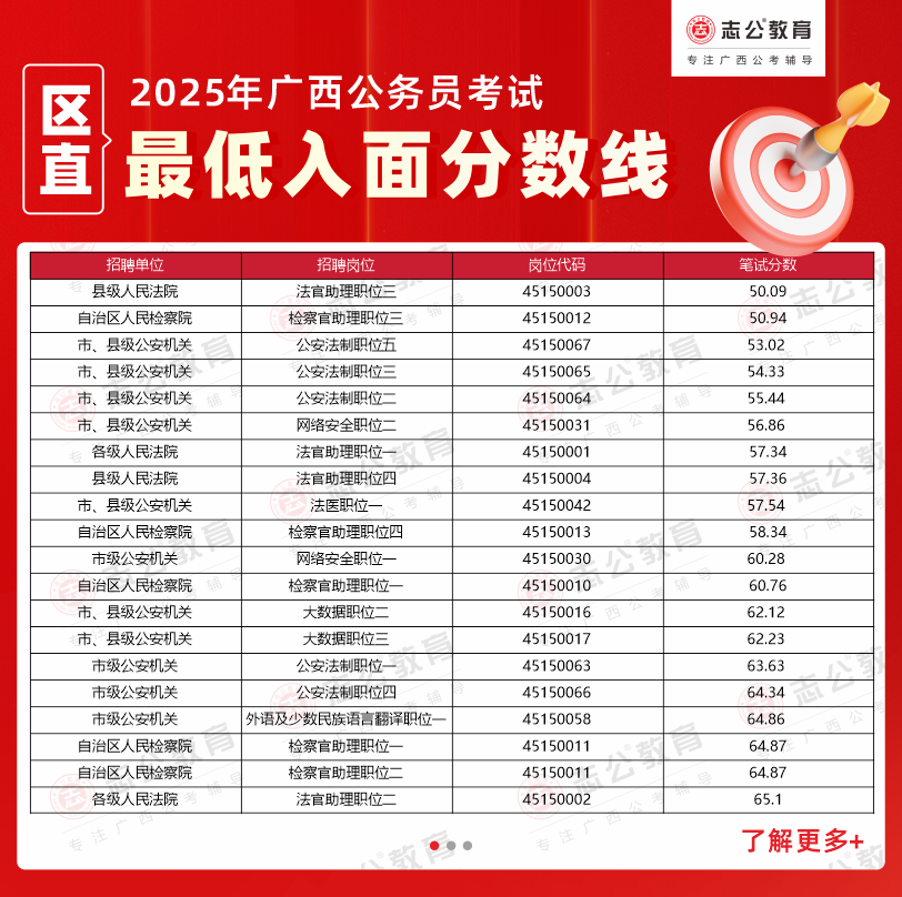 2025年廣西公務員考試筆試成績及面試入圍名單已公布。為幫助考生了解各單位招錄情況,本文根據(jù)官方發(fā)布的面試資格審查公告,整理了部分區(qū)直單位的進面分數(shù)數(shù)據(jù),供廣大考生在備考過程中進行參考。