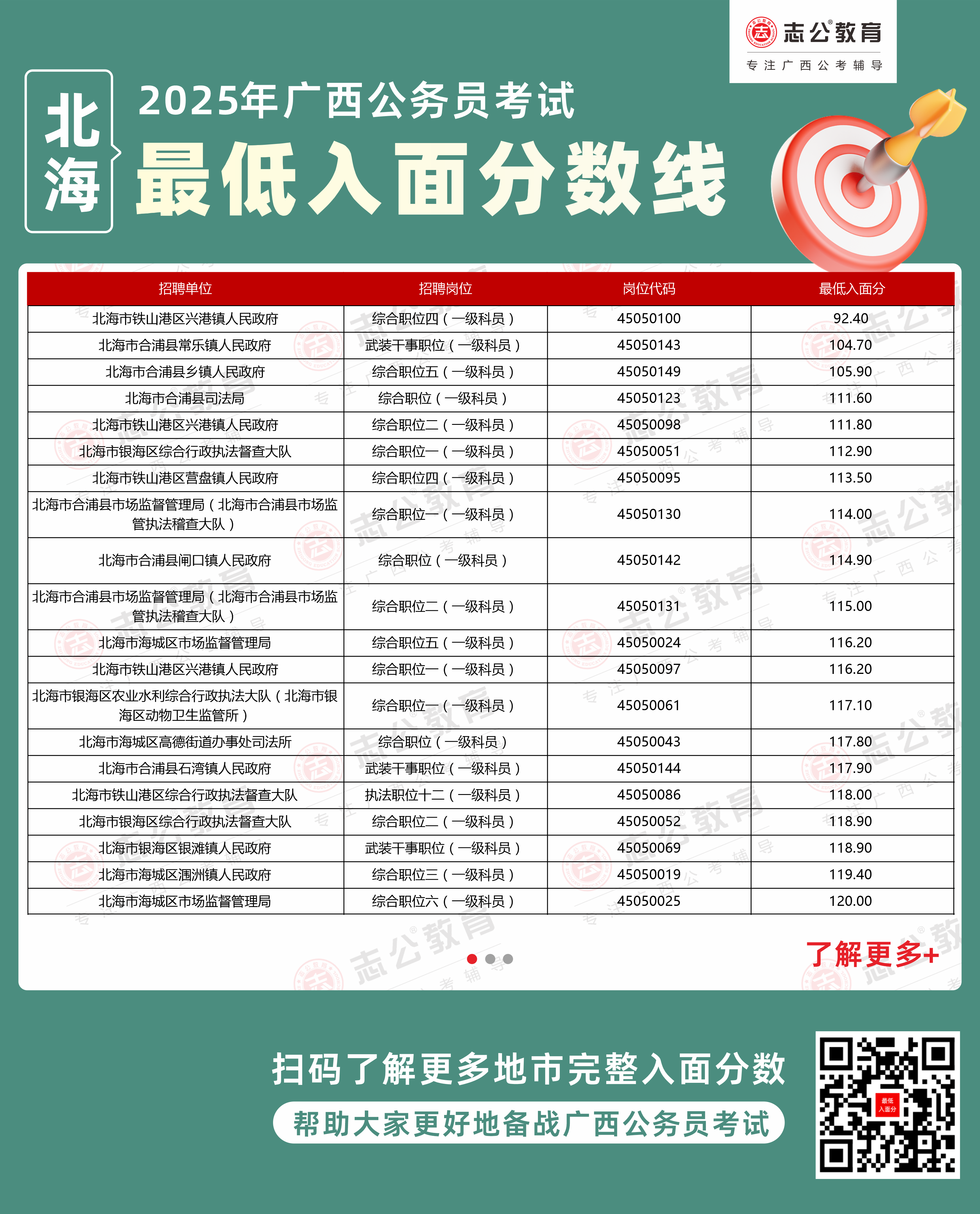 以下為志公教育根據(jù)官方公布的面試資格審查公告及擬錄用人員公示整理的北海市部分單位的進(jìn)面最低筆試分?jǐn)?shù)(含照顧加分),數(shù)據(jù)僅供參考,具體以官方實(shí)際公布為準(zhǔn)。