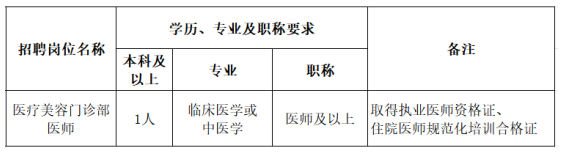 根據(jù)醫(yī)院發(fā)展需要,現(xiàn)面向社會招聘醫(yī)療美容門診部醫(yī)師,有關(guān)招聘事項(xiàng)公告如下:
